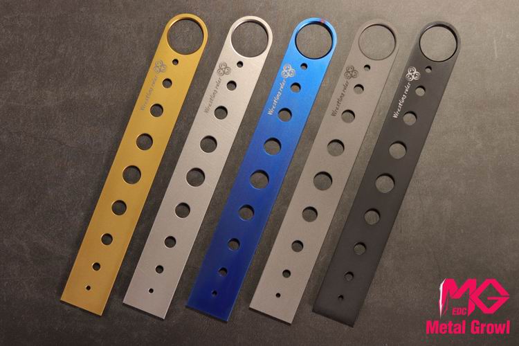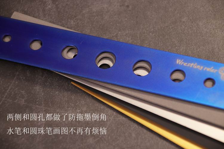 说下这款防卫尺的设计理念,首先必须是钛合金材质,重量轻,强度高(不过把玩还是要小心,砸水泥地上尖角还是会损伤)。这是一只量具15CM的直尺,两侧分别是公制和英制标注,中间为不同尺寸的圆孔,方便画图,总体来说这是一把画图尺,正面是立体面打磨,反面是平面打磨,整体厚度2MM,不用担心平直问题,我们平磨的非常到位,细节问题的话,两条边和所有的圆孔我们都做了底部倒角(专业叫法:防拖墨槽),简单说就是普通直尺用铅笔,水笔画图,有时候画图会被粘在尺边缘的墨水或者铅芯拖拉出不需要的痕迹,造成整图报废,我们这款有了这条槽,直接有效避免了这个问题,专业画图的小伙伴都明白。最后说下后面的转环,环的内外都做了弧形倒角,很舒服不卡手,手指穿进去,然后玩花爪有没有~~~ 都玩过抓子不,想想帅不帅~~